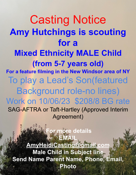 Amy Hutchings is casting for a male child of mixed ethnicity, aged between 5-7 years old, to play a supporting role as the lead’s son in a feature film in upstate New York. (This is a featured background role with no lines).
