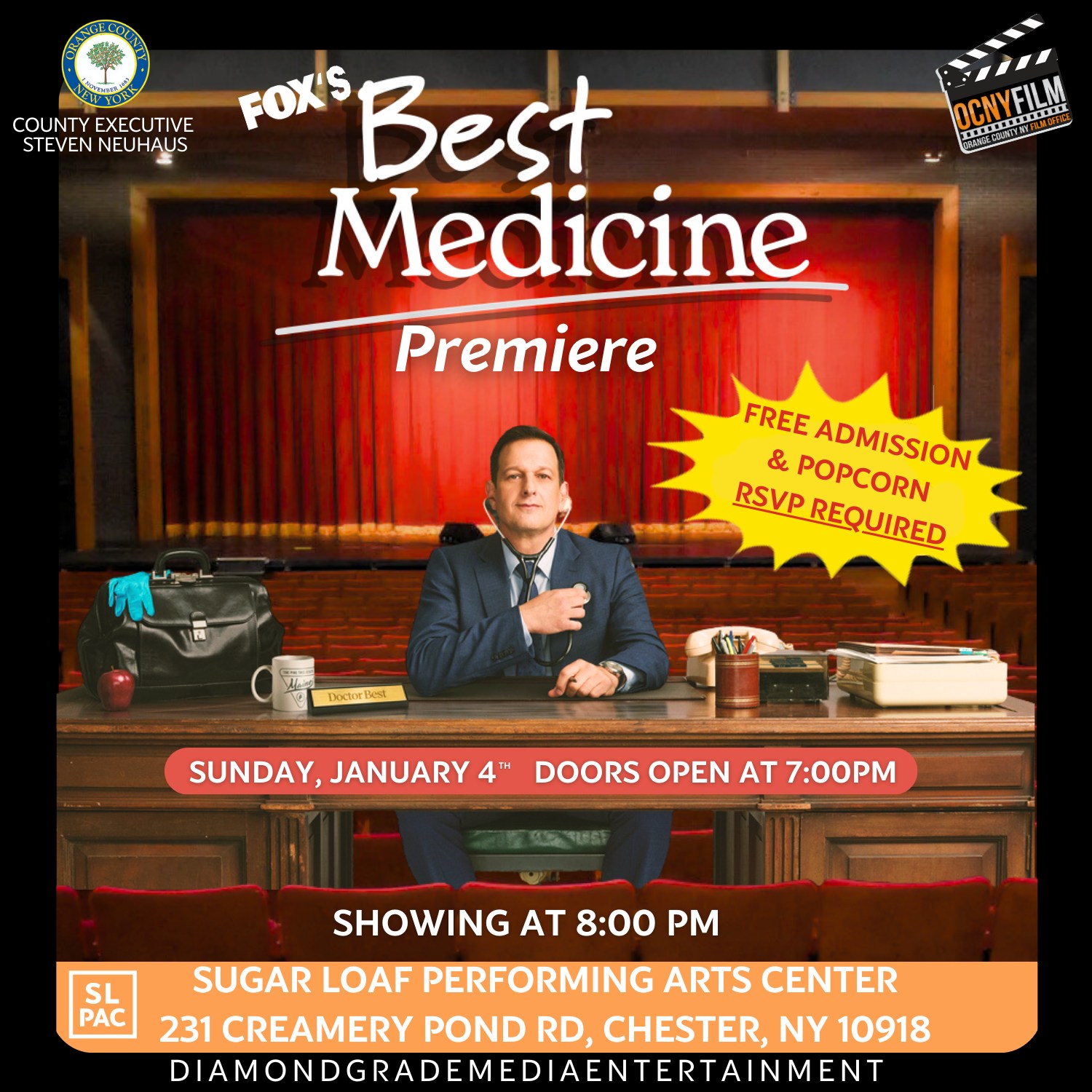 Sugar Loaf Performing Arts Center 231 Creamery Pond Rd, ChesterAbout the Show: Doors 7PM | Show 8PM. JOIN US FOR THE GLOBAL PREMIERE OF FOX’S BEST MEDICINE! The Orange County Film Office invites you to a FREE live screening of Best Medicine filmed over the last 9 months in Orange County, NY and the greater Hudson Valley. Starring Josh Charles as the brilliant but… Continue reading Fox’s Best Medicine Premier